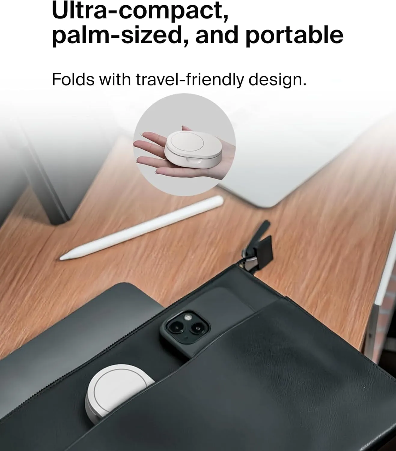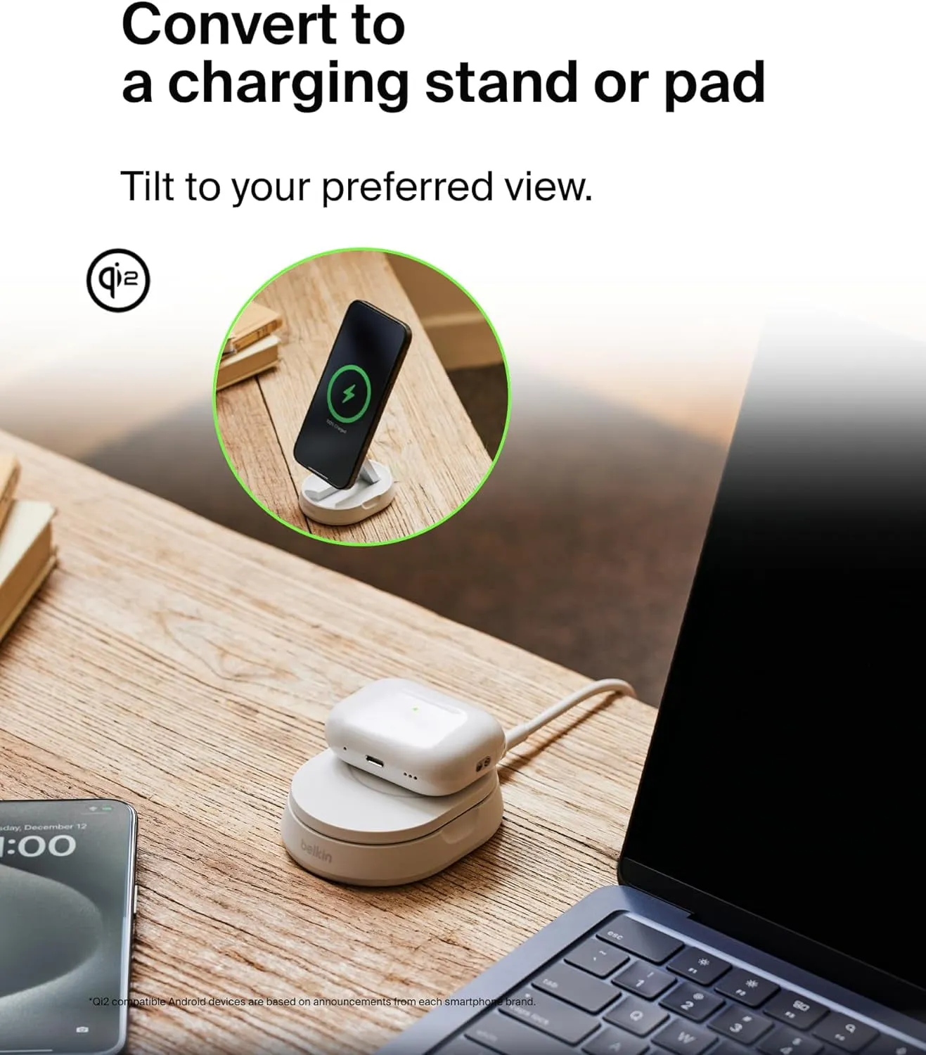 • Fast charge your iPhone(R) or Qi2 compatible device up to 15 watts ;• Qi2 optimizes energy usage and safeguards device battery life;• Magnetic, adaptive charging offers more speed and safety features;• Use in stand or pad mode and tilt to your preferred view angle: supports 0deg to 70deg stand angle and 0deg to 75deg pad angle;• Apple(R) users enjoy Standby-ready features in stand mode;• Travel-friendly compact design folds and takes up limited space when you're on the go ;• Keep your phone case on while charging;• Made of eco-friendly post-consumer recycled materials and 100% plastic-free packaging (excluding cable);• Connected Equipment Warranty (CEW) up to $2,500 for peace of mind ;• Includes 5-ft. USB-C(R) to USB-C(R) cable;