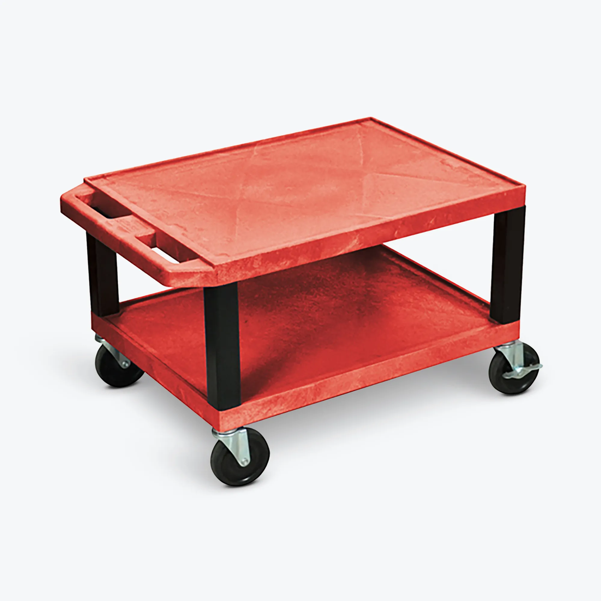 This rolling AV cart stands 16 inches high and features two sturdy 1.5-inch thick shelves, perfect for supporting and transporting audio/video equipment and more. Each shelf has a textured surface with a 0.25-inch retaining lip to keep your items secure and is constructed from molded plastic that resists chipping, warping, scratching, rusting, and peeling.