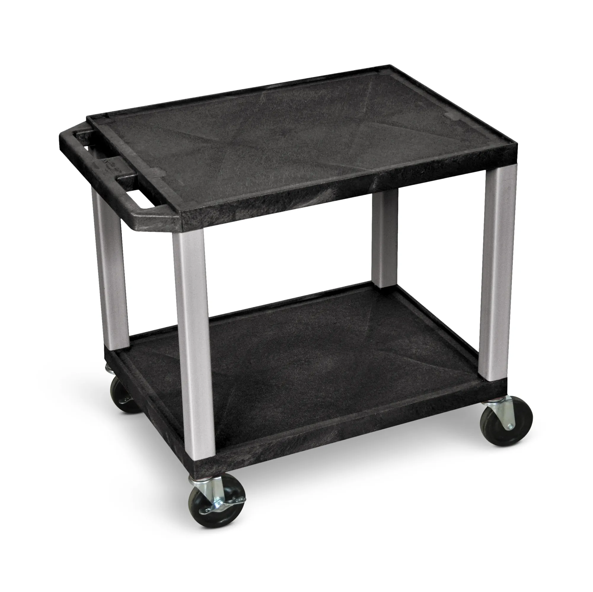 Whether you're looking for a versatile AV cart or a multipurpose utility cart, the Luxor Tuffy is built to last. This mobile cart features two shelves made from durable thermoplastic resin that resists chipping, warping, scratching, rusting, and peeling. The textured surface includes a .25" retaining lip to help secure your items. For added convenience, a molded push handle is provided on the top shelf, along with a built-in three-outlet electrical assembly. The four heavy-duty casters enable smooth mobility across various surfaces, and the cart can be stabilized using two locking brakes. Proudly made in the USA.