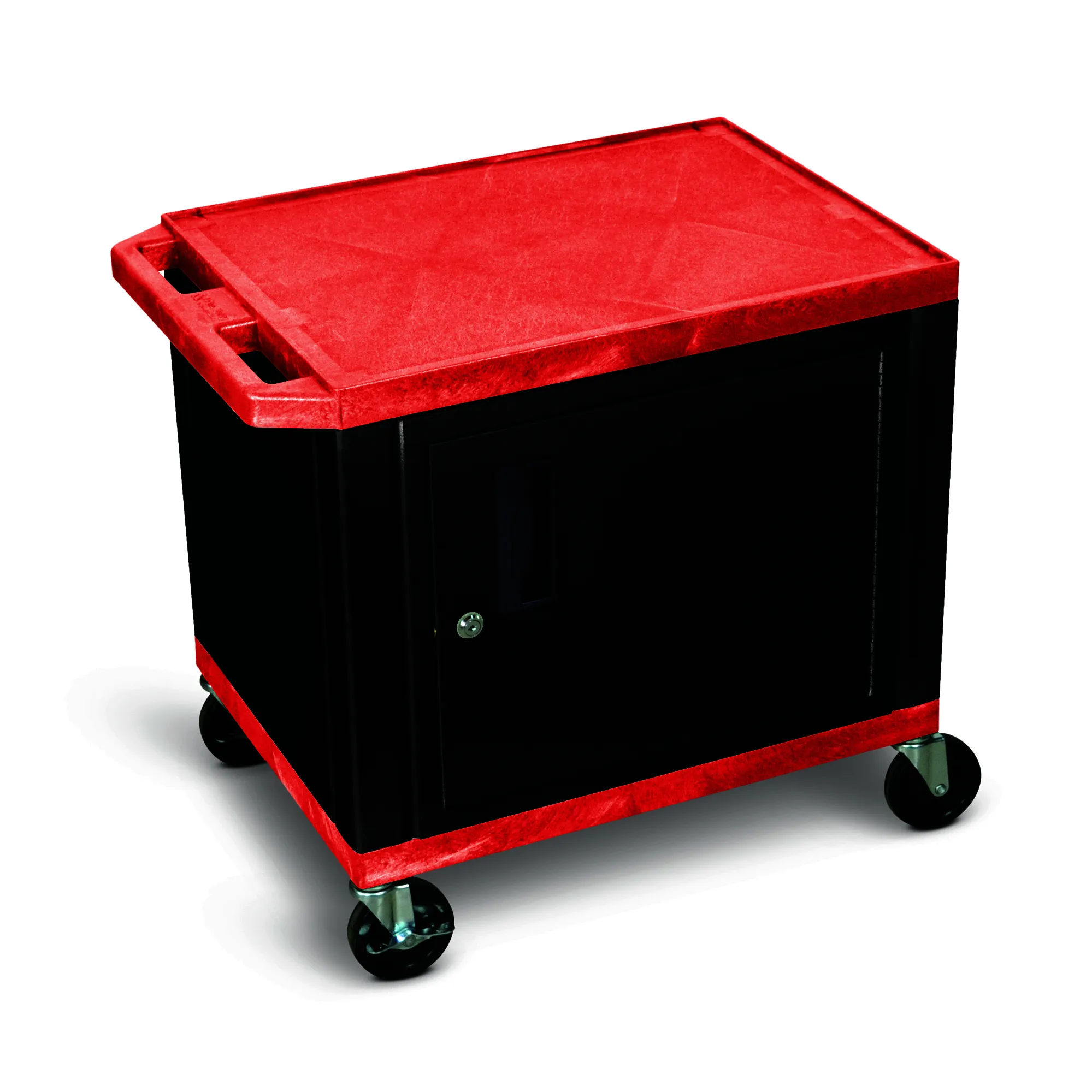 The Luxor Tuffy Red 2-Shelf AV Cart is a versatile mobile utility cart designed for durability and functionality. Perfect for both audio/video equipment and general utility use, its shelves are crafted from robust thermoplastic resin that resists chipping, warping, scratching, rusting, and peeling. This cart includes a secure locking steel cabinet for equipment storage, a textured surface to prevent item slippage, and a .25" retaining lip for added security. The ergonomic push handle ensures easy maneuvering, while the built-in three-outlet electrical assembly offers enhanced convenience. With four durable casters, two of which are equipped with locking brakes, this cart promises smooth mobility across various surfaces, all while being proudly made in the USA.