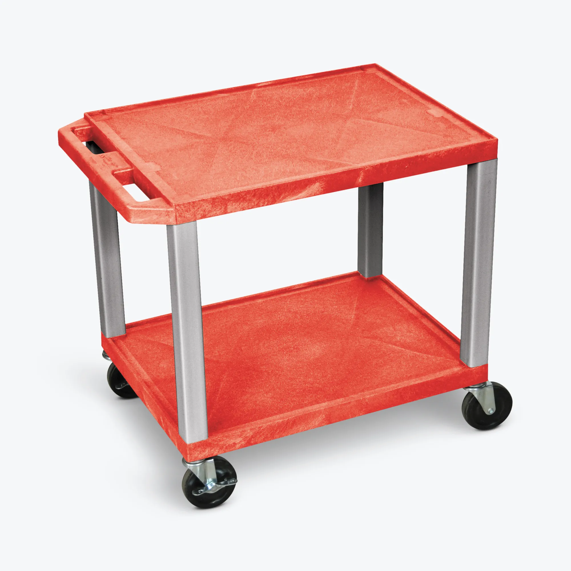 The Luxor Tuffy Red 2-Shelf AV Cart is designed for versatility and durability. Perfect for A/V equipment, presentations, or even as a mobile utility cart, it features two robust shelves crafted from thermoplastic resin, ensuring they resist chipping, warping, and scratching. The top shelf is equipped with a molded push handle for easy maneuverability and includes a built-in three-outlet electrical assembly for convenience. The cart is mobile, thanks to four heavy-duty casters that glide smoothly over various surfaces, while two locking brakes provide stability when needed. Proudly made in the USA, this cart is an essential tool for any workspace or classroom.
