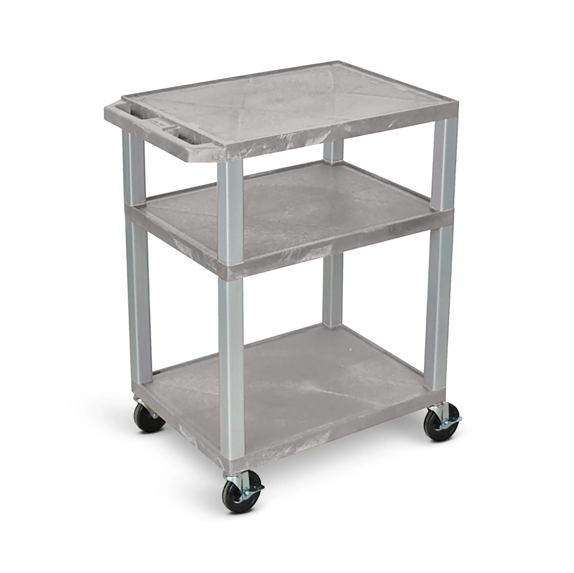 Designed for versatility and ease of use, the Luxor Tuffy 3 Shelf AV Cart is perfect for classrooms, offices, and presentations. Made in the USA, this cart features durable molded plastic shelves that resist chipping, warping, scratching, rusting, and peeling. Each shelf is equipped with a .25" retaining lip to secure items, while the top shelf includes a recessed three-outlet UL-Listed electrical assembly for convenient power access.