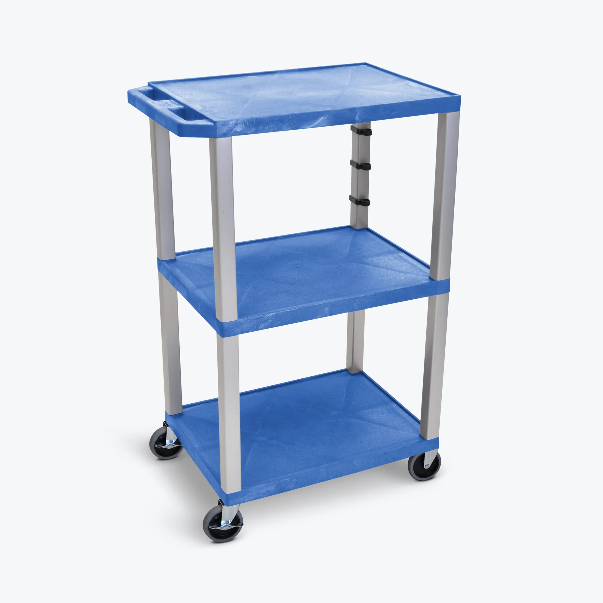The Luxor Tuffy 3 Shelf AV Cart is constructed from recycled molded plastic, ensuring durability and resistance to scratches, dents, rust, and stains. Each three flat shelves, measuring 1.5" thick, features a .25" retaining lip and a textured surface to secure contents during transport. The top shelf is equipped with a recessed, three-outlet UL-Listed electrical assembly for easy access to power. Its square legs provide stable support, while four 4" ball bearing casters (two with locking brakes) paired with an ergonomic push handle enable effortless movement.