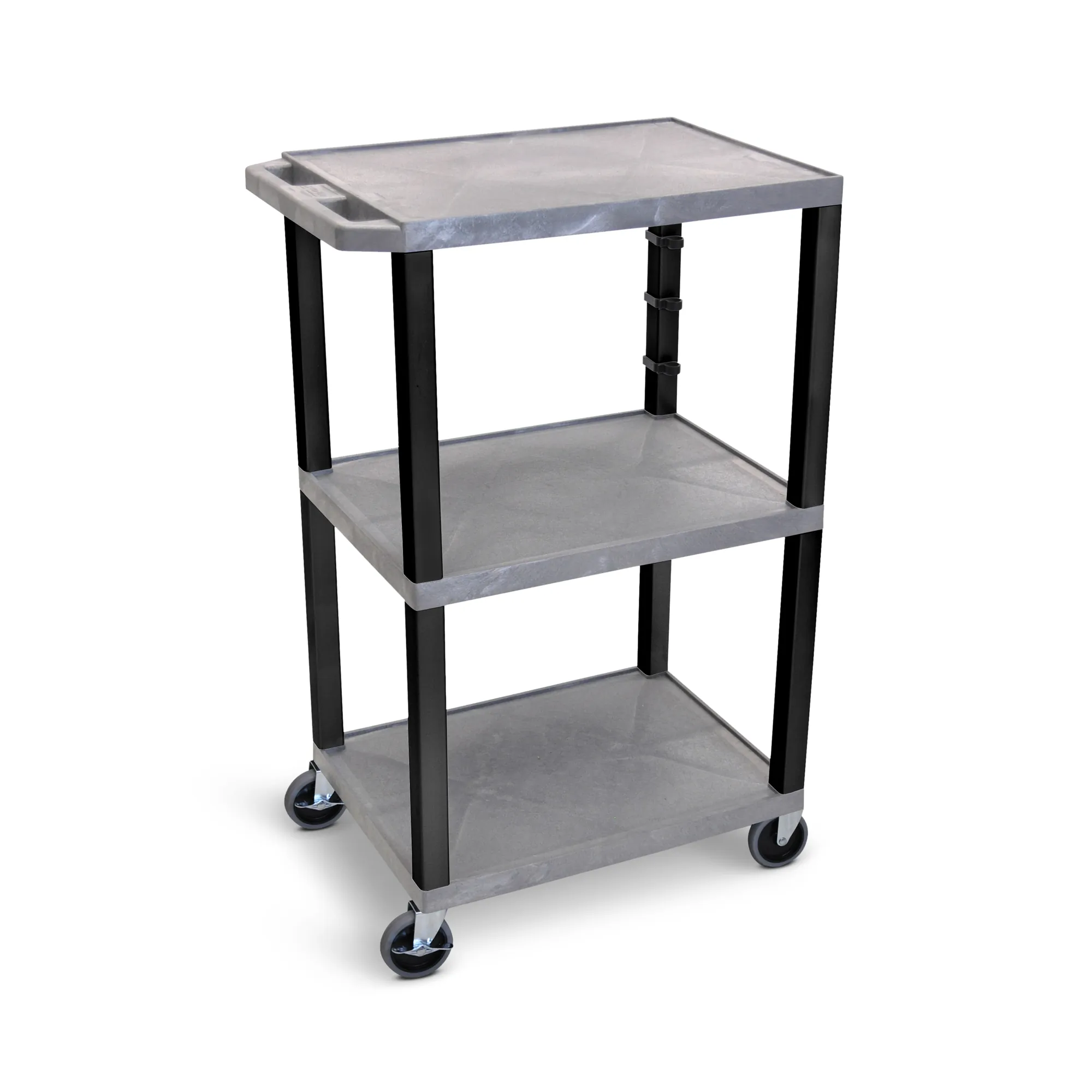 The Luxor Gray Tuffy AV Cart is constructed from durable, recycled molded plastic, ensuring it won't scratch, dent, rust, or stain. This versatile cart features three flat shelves that are 1.5" thick with a .25" retaining lip to securely hold your equipment. The top shelf includes a recessed, three-outlet UL-Listed electrical assembly for convenient power access, making it ideal for various settings.