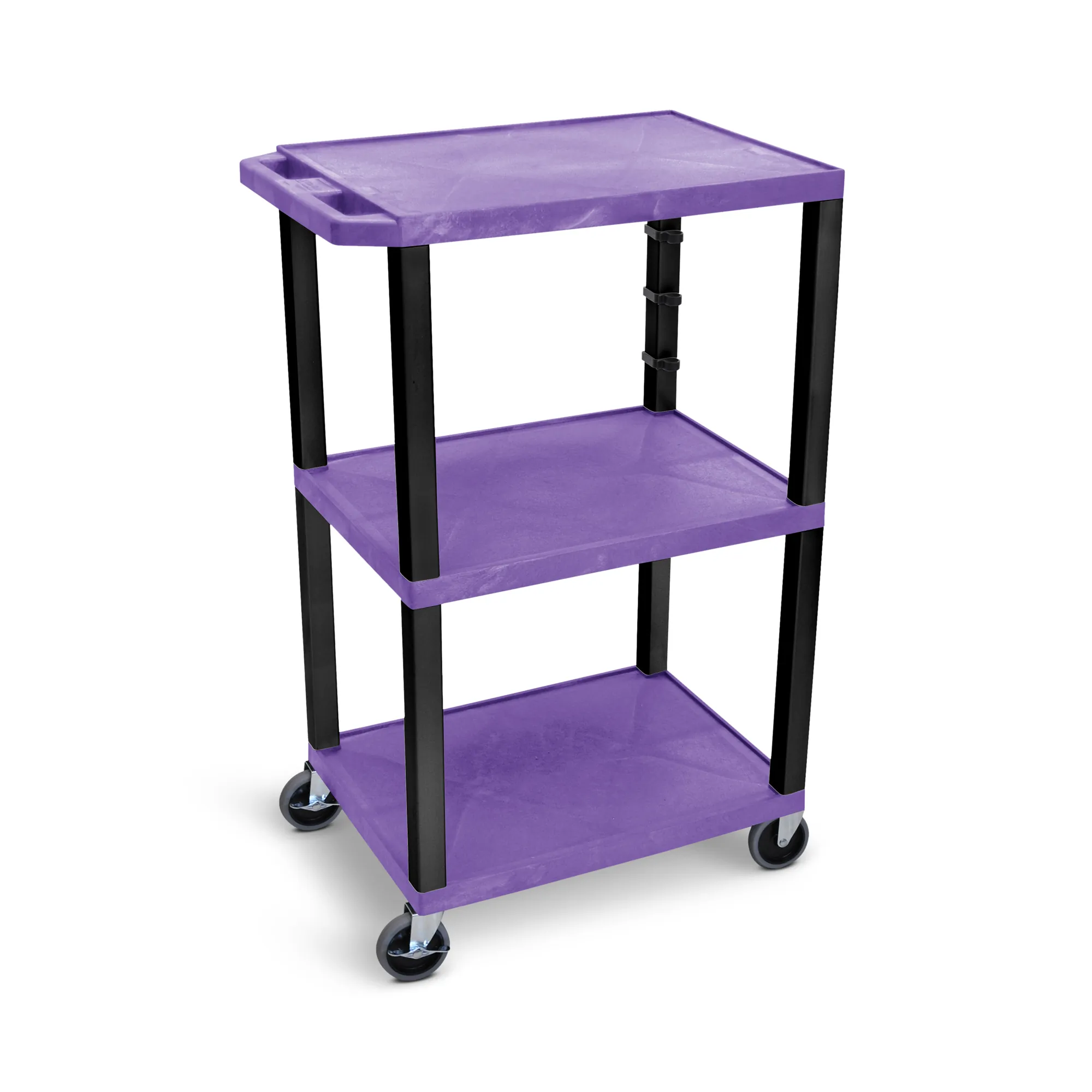 The Luxor 42" Purple Tuffy 3-Shelf AV Cart is a versatile and durable solution for transporting A/V equipment. Constructed from recycled molded plastic, this cart is built to last, resisting scratches, dents, rust, and stains. Each of its three shelves features a 1.5" thickness with a .25" retaining lip and a textured surface to prevent items from sliding off during movement.
