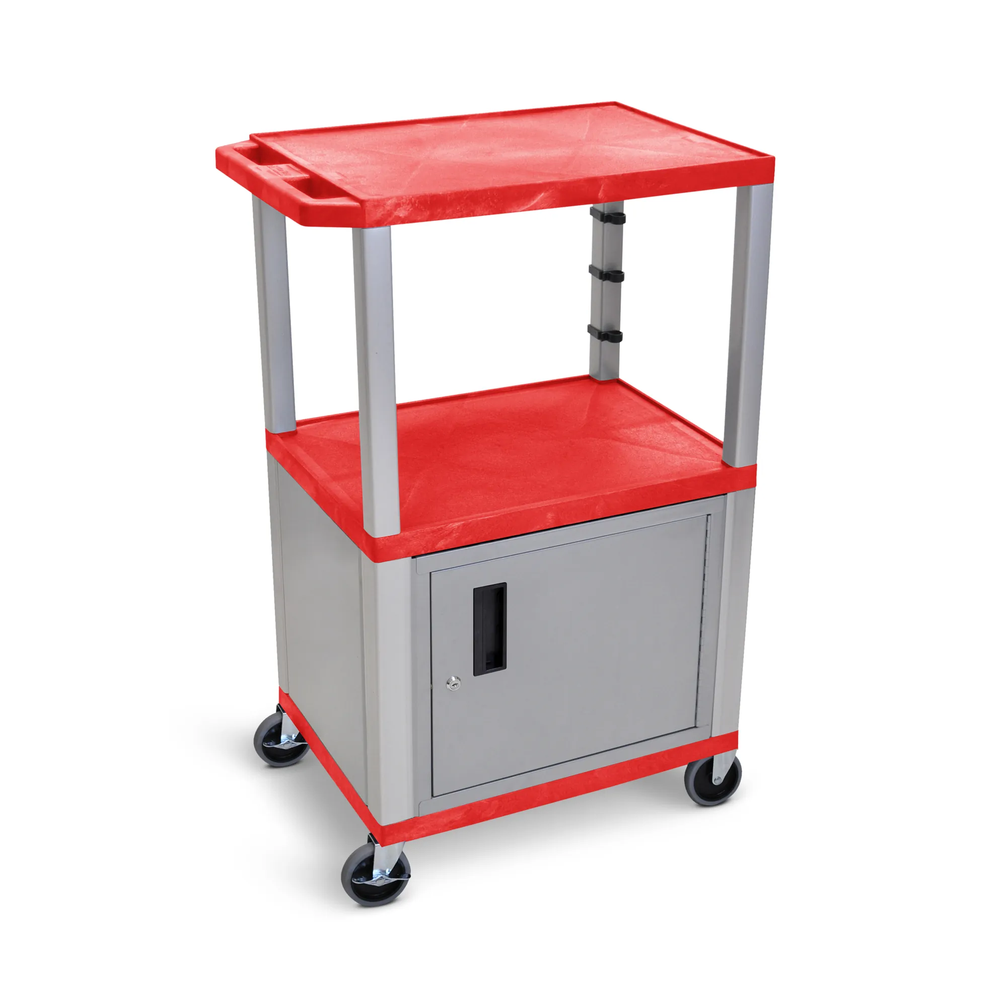 The Luxor Red Tuffy 3-Shelf AV Cart is designed for durability and ease of use. Constructed from recycled molded plastic, this cart will not scratch, dent, rust, or stain. Each of the three shelves features a 1.5" thickness and a .25" retaining lip, ensuring your equipment stays secure during transportation. The cart is equipped with a 20-gauge steel locking cabinet for safe equipment storage, along with a recessed, three-outlet UL-Listed electrical assembly for convenient power access. Its square legs provide strong support, while the four 4" ball bearing casters, two of which have locking brakes, along with the integrated push handle, allow for easy mobility.