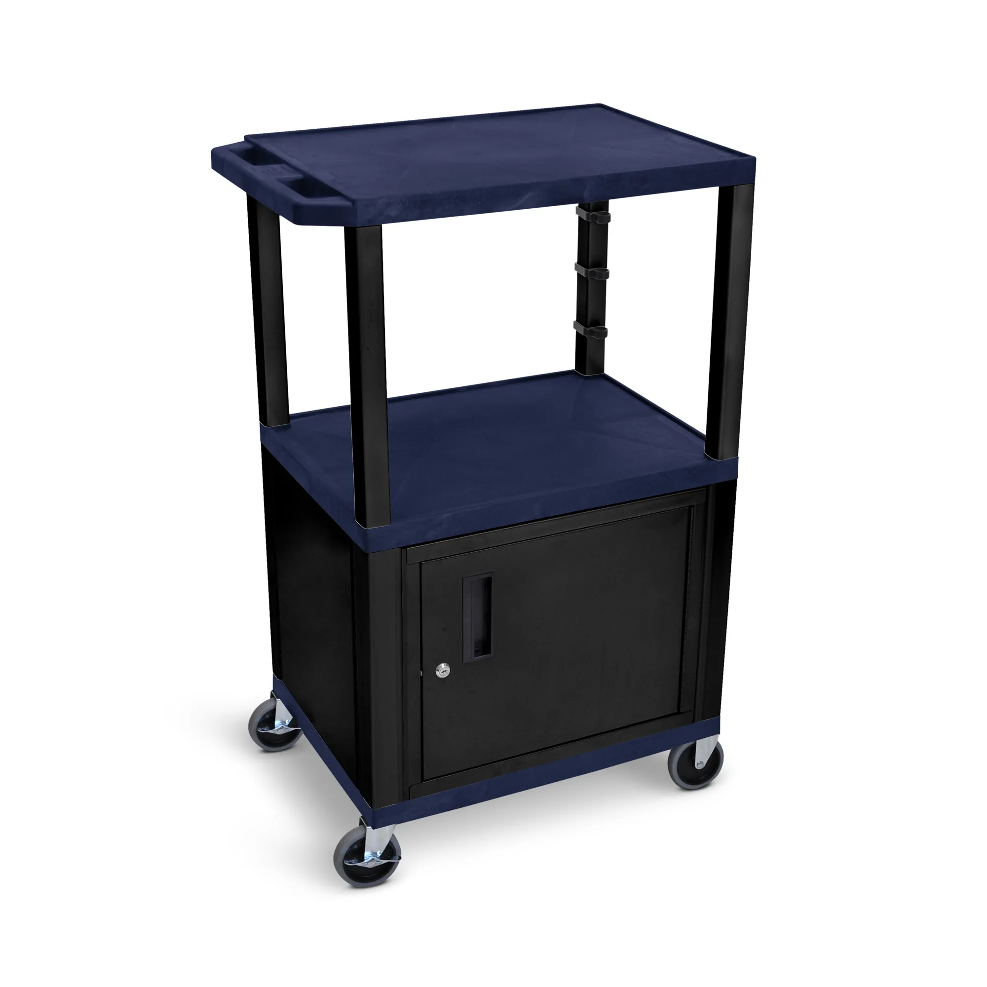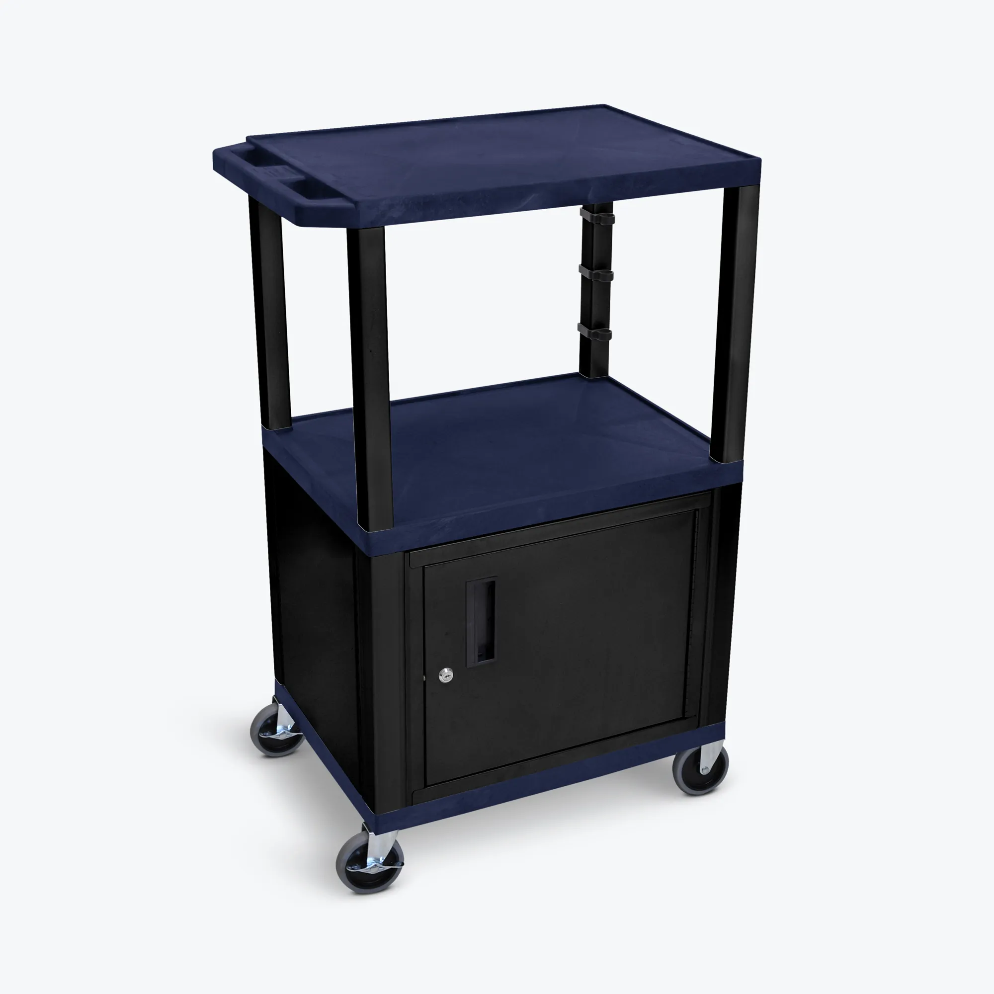 The Luxor Navy Blue Tuffy 3 Shelf AV Cart is designed for durability and convenience. Made from recycled molded plastic, this cart is resistant to scratches, dents, rust, and stains. Each of the three shelves measures 1.5 inches thick and features a .25-inch retaining lip and textured surface to prevent items from sliding off during transport.