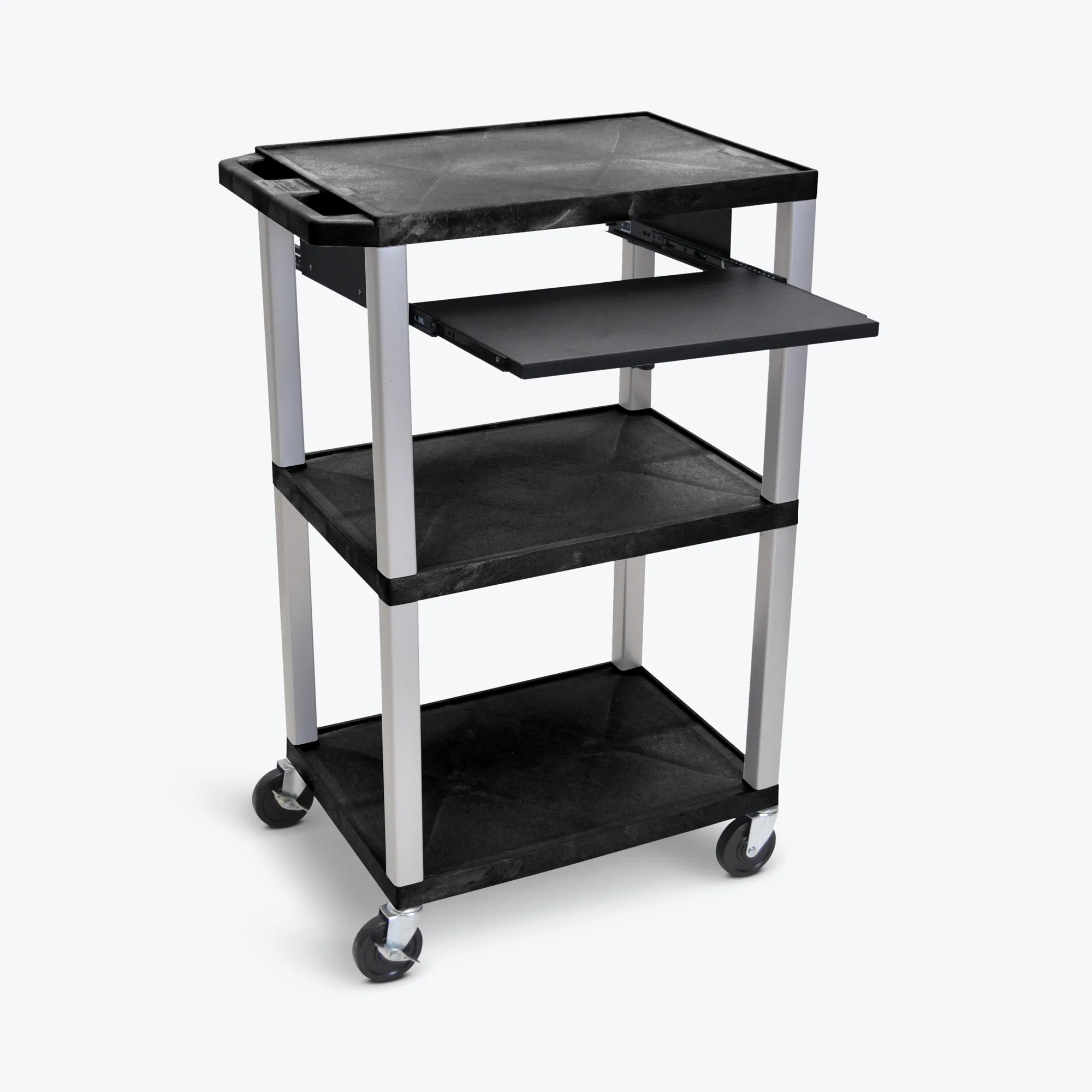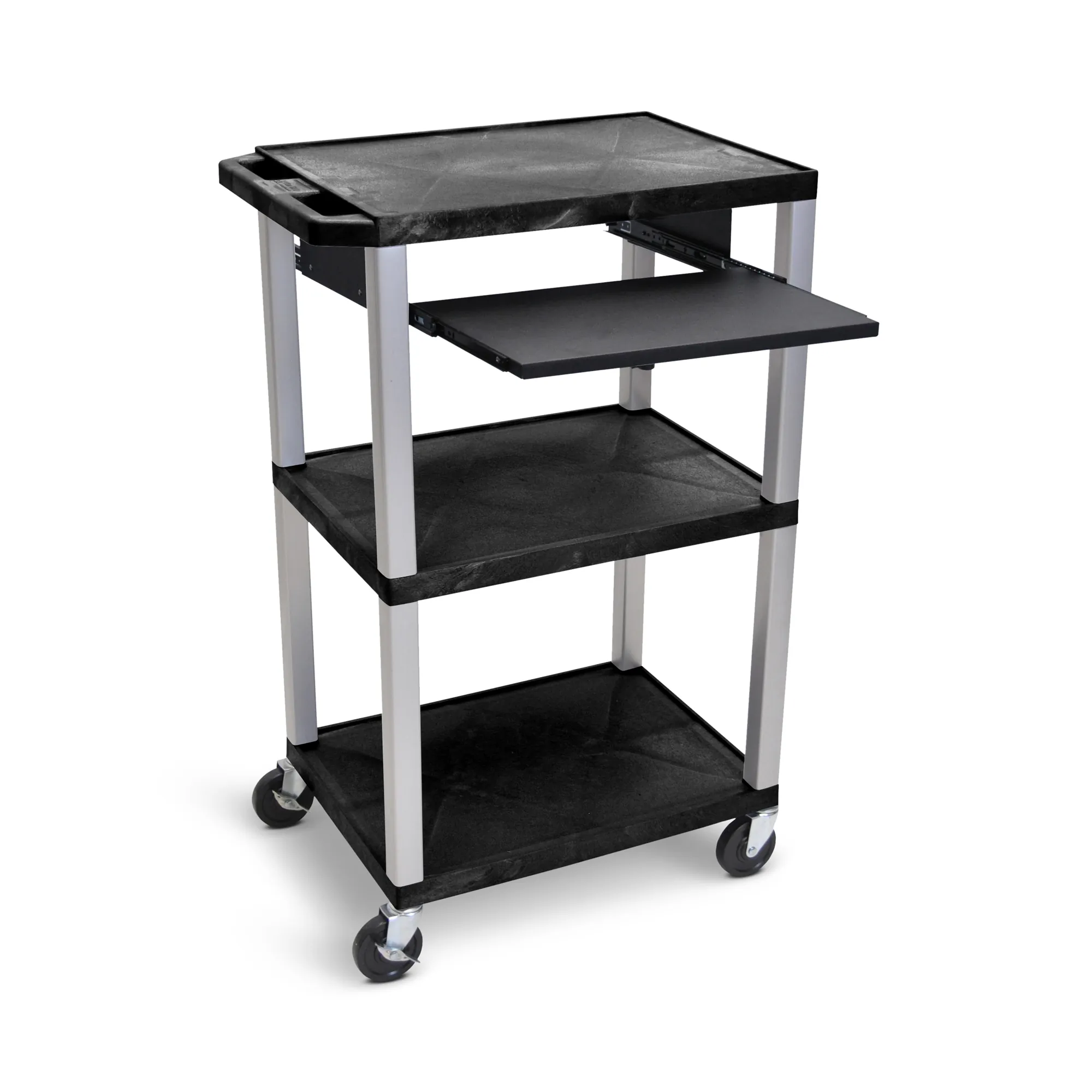 The Luxor Tuffy Black 42" 3-Shelf Cart is designed for both durability and versatility. Featuring three 1.5"-thick molded plastic shelves that resist scratches, dents, rust, and stains, this AV cart ensures longevity and reliability. The front pullout tray provides an excellent support surface for keyboards or laptops, along with a three-outlet recessed electrical assembly for convenient power access.