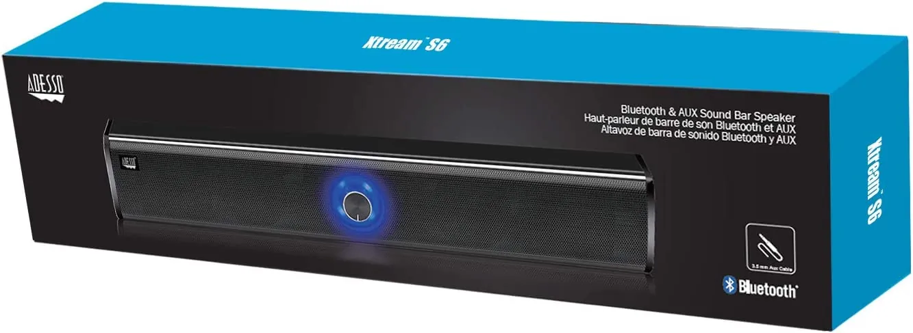The Adesso Xtream S6 is a high power 10W*2 desktop wireless/aux sound bar speaker. The Adesso Xtream S6 features Bluetooth 5.0 wireless audio to go along with bass subwoofer sound technology. Immerse yourself in the rich sound of music, movies, and games as this speaker is integrated with dual speaker units that deliver the mind blowing stereo sound. Suitable for your home, your office, school and any other place, also a perfect gift for your friend and your family.
