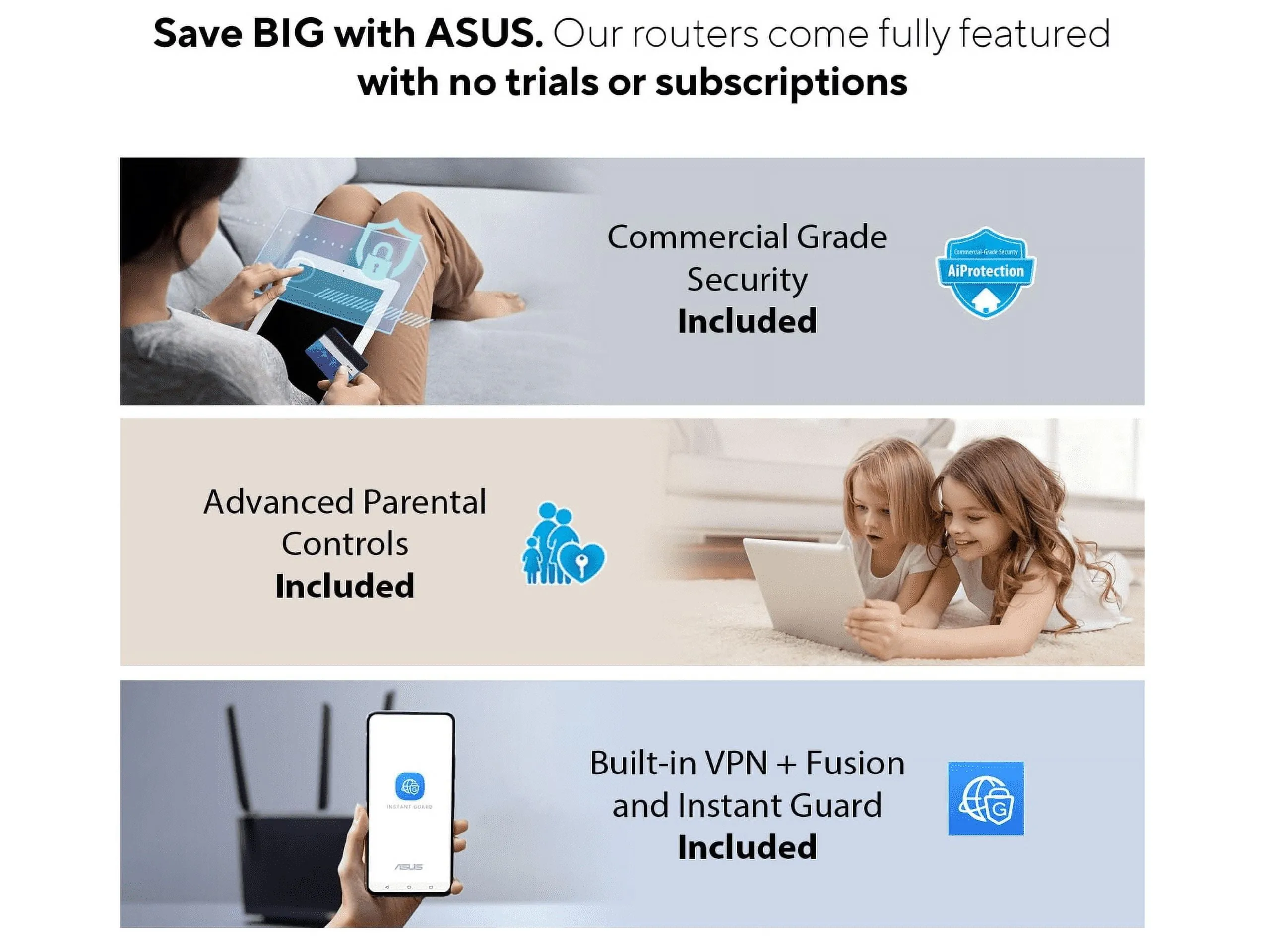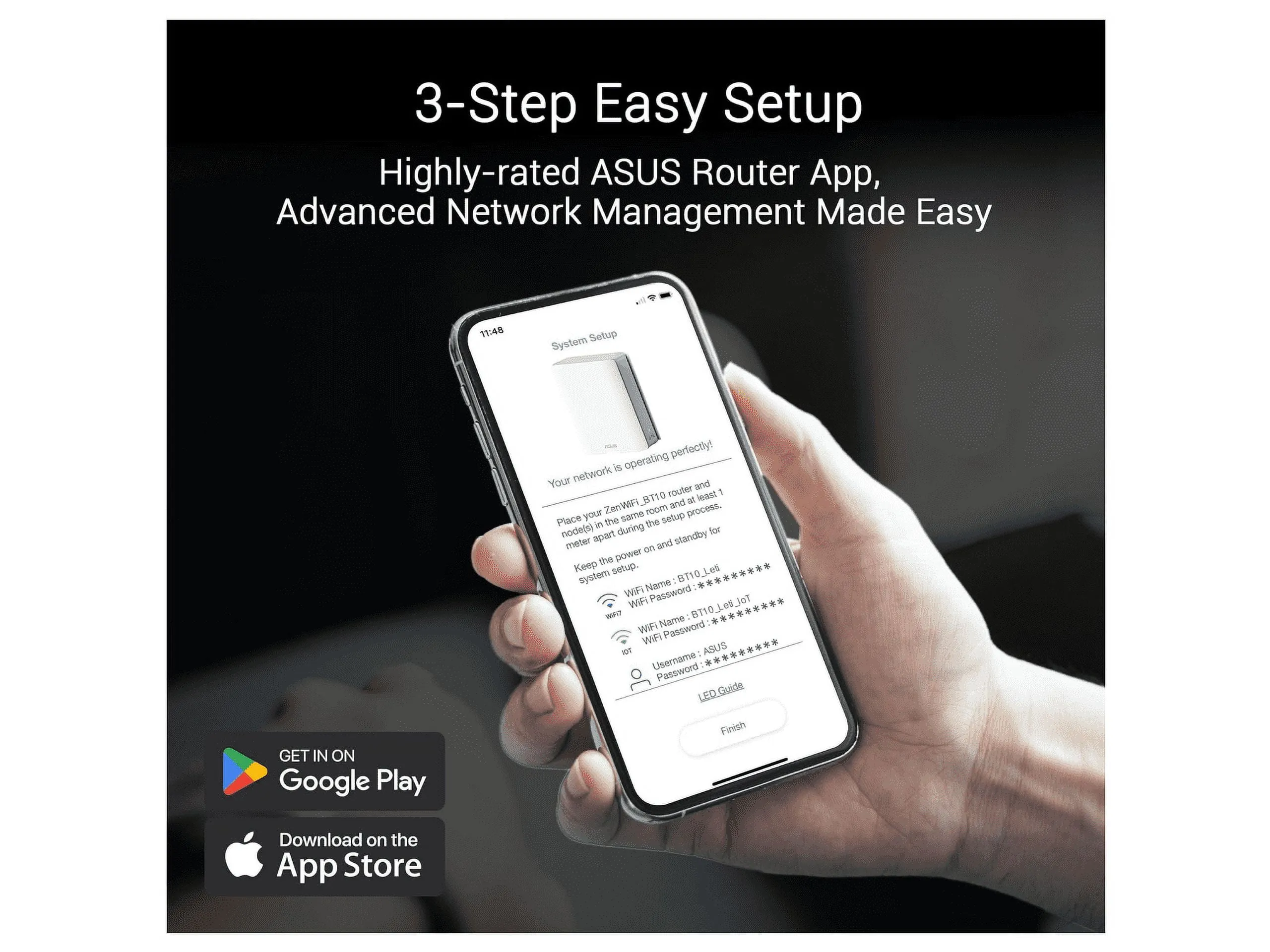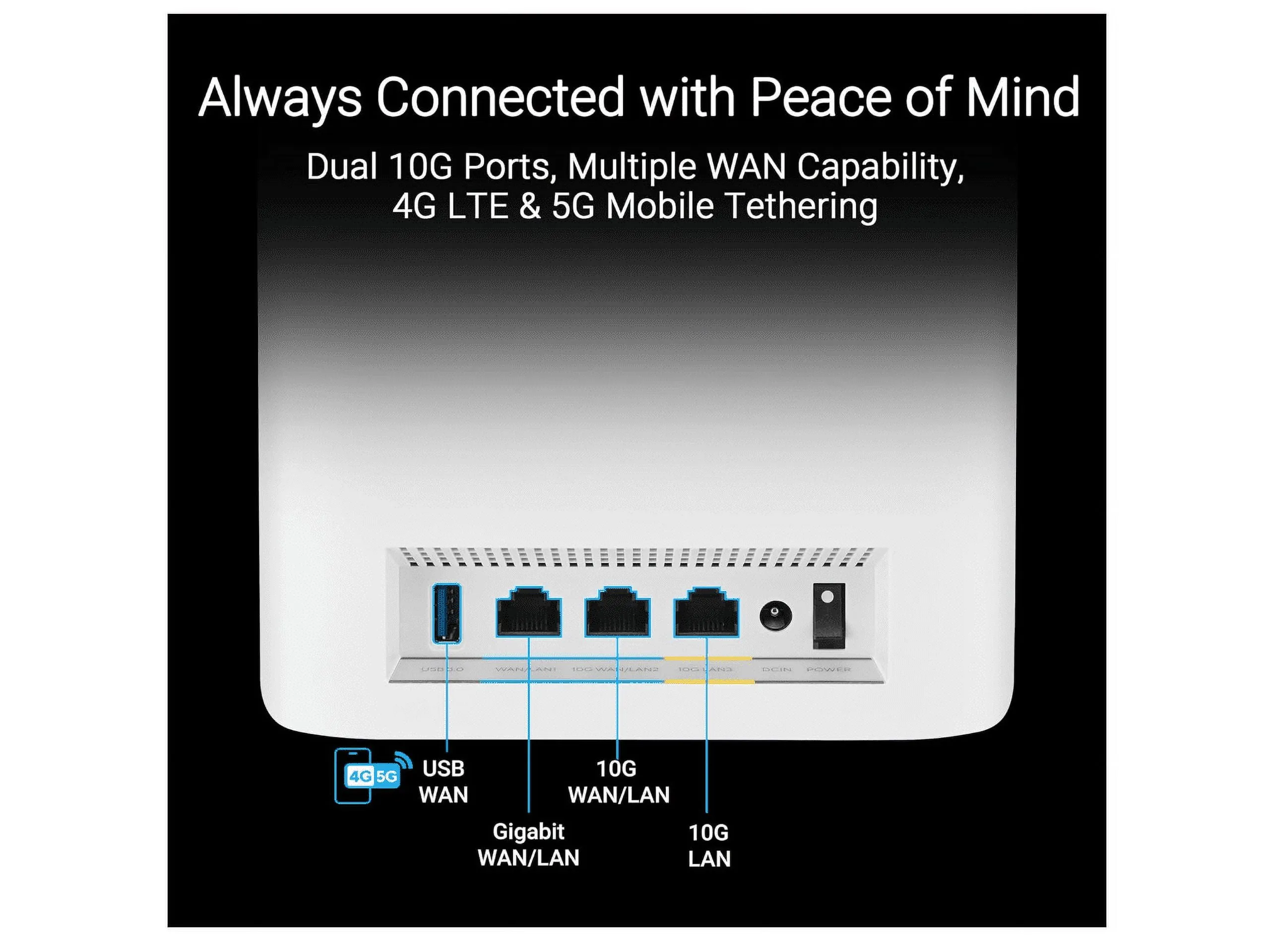 Equipped with Dual 10G Ports, it supports high-speed wired connections. The ZenWiFi BT10 includes advanced security features and parental controls, providing peace of mind for families while offering Smart Home Master SSIDs for streamlined device management. Plus, enjoy the convenience of 4G & 5G Mobile Tethering to keep you connected anywhere.
