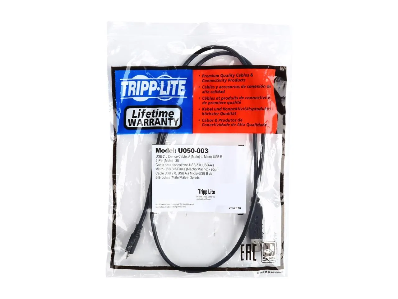 • Connects to micro USB port on cellular phones, PDAs, USB devices, digital cameras & more;• Provides both data & power transfers;• 480Mbps USB 2.0 data transfer rates;• RoHS compliant;• Lifetime warranty;• 3ft;