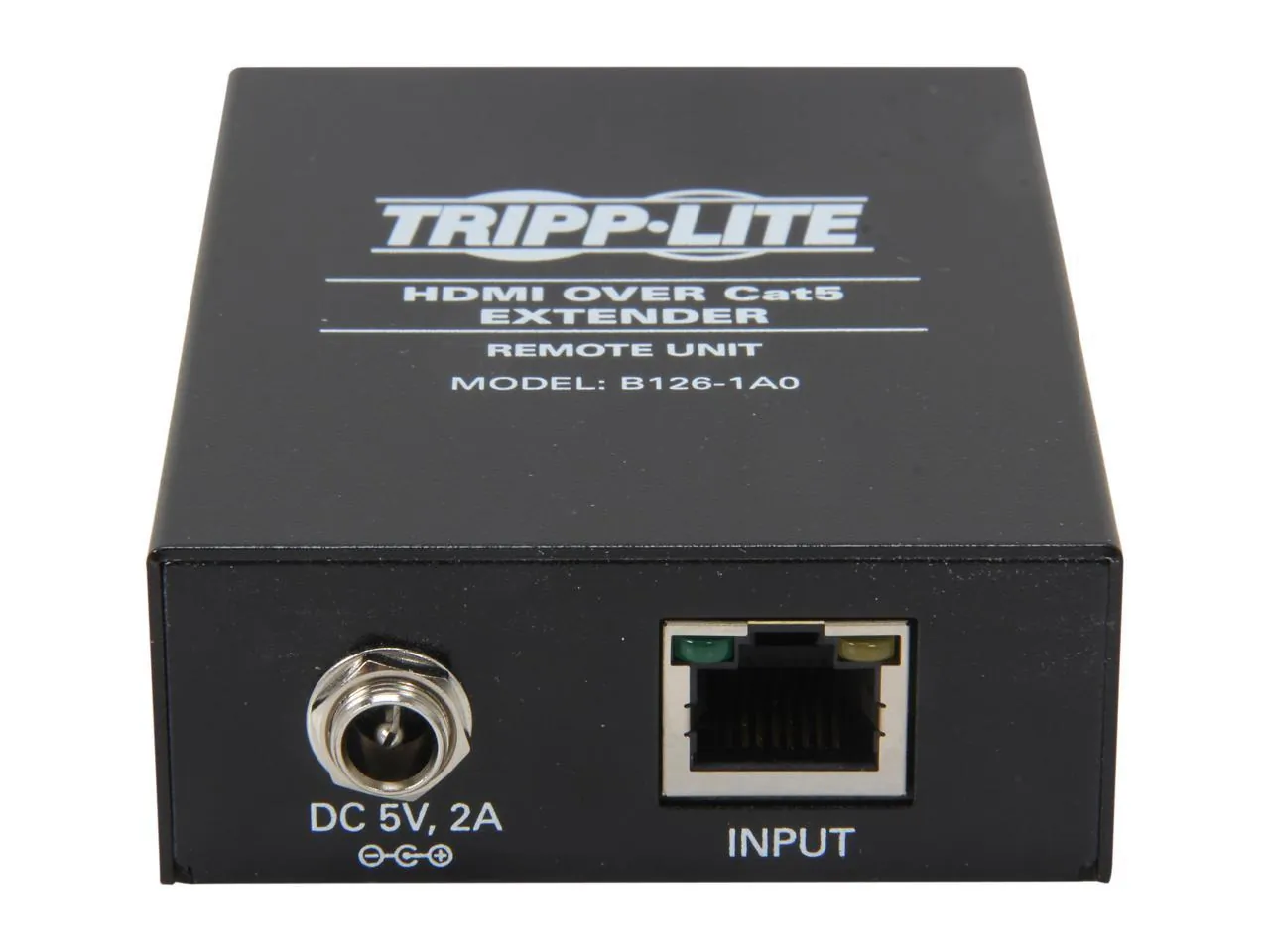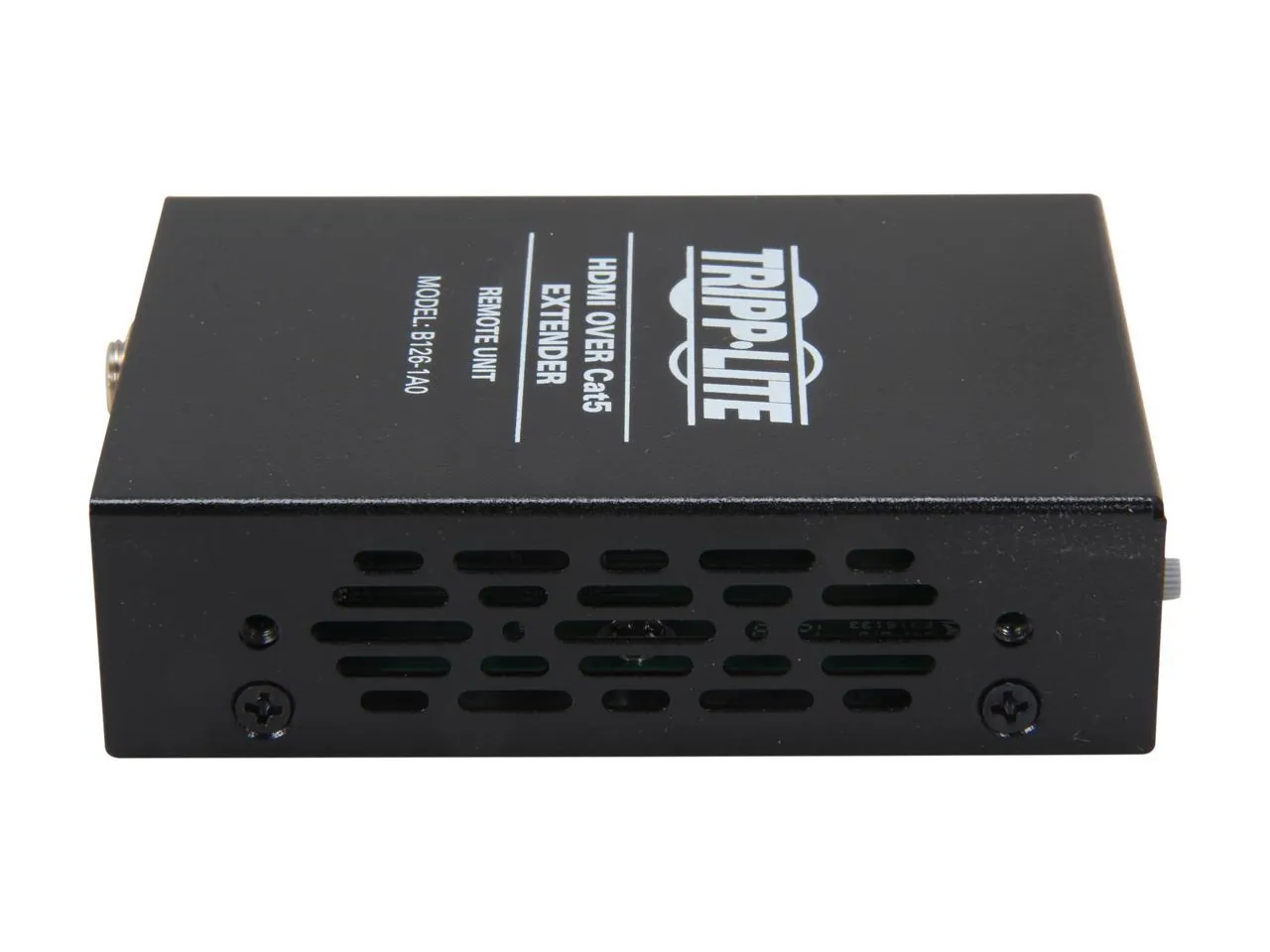 The B126-1A0 is an active extender remote unit for the B126-002 (2-Port) and B126-004 (4-Port) HDMI Over Cat5 Extender/Splitter local units. When using 24Awg, Solid Wire Cat5e/6 cable (Tripp Lite N202-Series), the B126-1A0 can extend a 1080i (60Hz) signal up to 200 ft.; or, a 1080p (60Hz) signal up to 150 ft.. An Equalization setting is built-in to the unit, allowing for adjustment of the video image. When used with a B126-002 or B126-004, both stereo audio and 7.1 channel surround sound audio are supported, as well as HDCP protected content. Mounting hardware is included, allowing the unit to be rackmounted, wallmounted or pole mounted. Compliant with the Federal Trade Agreements Act (TAA) for GSA Schedule purchases. 1 year limited warranty. Key Features Active extender remote unit for the B126-002 (2-Port) and B126-004 (4-Port) Extender/Splitter local units Extends a 1080i (60Hz) signal up to 200 ft.; or, a 1080p (60Hz) signal up to 150 ft. when using 24Awg, Solid Wire Cat5e/6 cable (Tripp Lite N202-Series) Features a built-in Equalization setting, allowing for adjustment of the video image When used with a B126-002 or B126-004, both stereo audio and 7.1 channel surround sound audio are supported, as well as HDCP protected content Mounting hardware is included, allowing the unit to be rackmounted, wallmounted or pole mounted No software or drivers required Compatible with all operating systems Compliant with the Federal Trade Agreements Act (TAA) for GSA Schedule purchases 1 year limited warranty Package Includes B126-1A0 HDMI Over Cat5 Active Extender Remote Unit Screwdriver for adjustment of Equalization Mounting hardware External power supply (Input: 100-240V, 50/60Hz, 0.5A Output: 5V, 2A) Owner's manual
