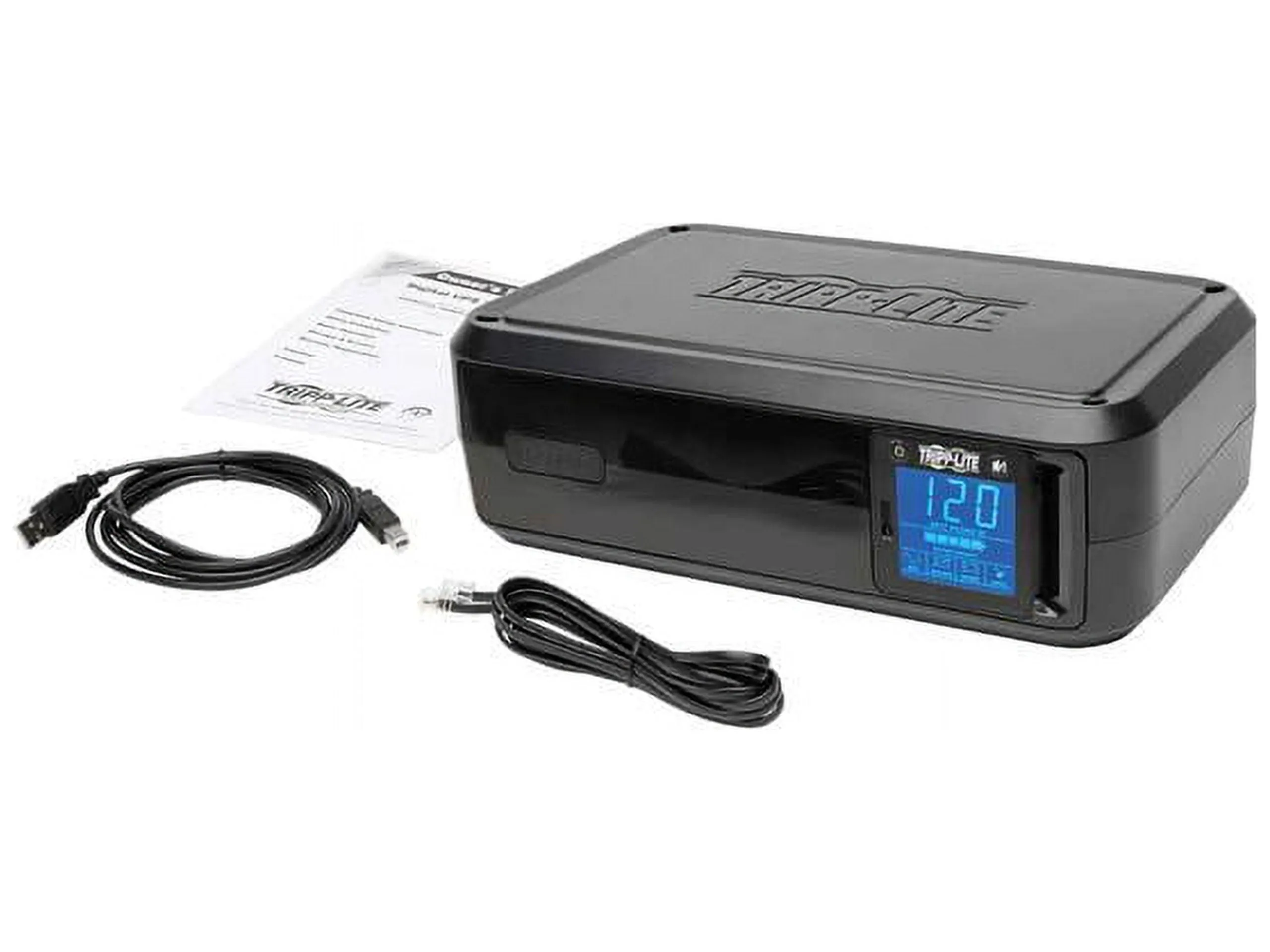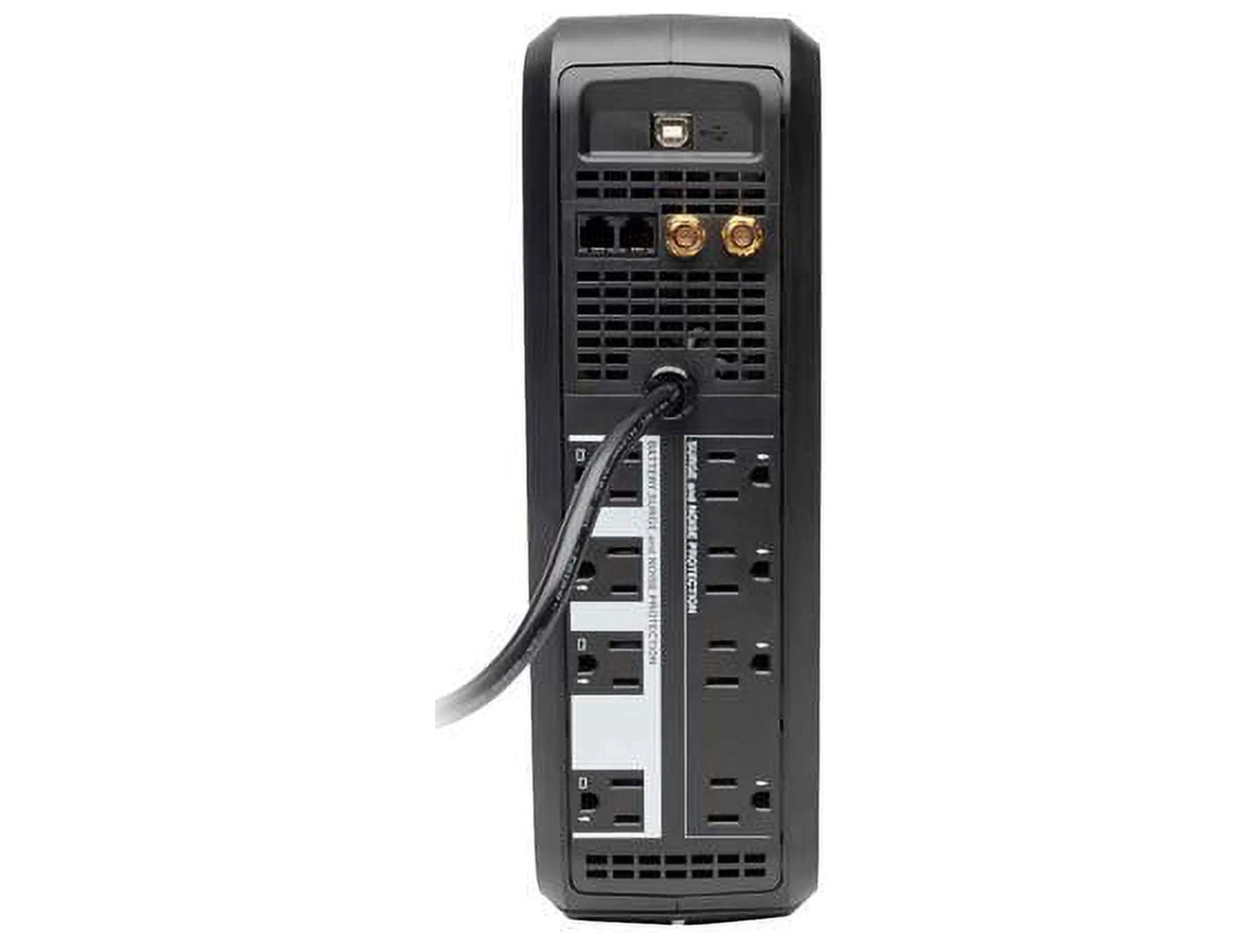 Marketing Information:Line-Interactive Digital UPS System offers voltage regulation, surge suppression and battery support for personal computers, network workstations and more. Internal UPS circuits support entry-level PCs for 60 minutes or individual VCR/DVR for 3 hours during power failure. AVR circuits regulate brownouts as low as 89 volts back to usable levels without using battery power. Includes 4 battery-supported outlets, plus 4 surge suppression-only outlets. USB port enables optional unattended system shutdown without data loss; cable included. HID-compliant USB interface enables integration with built-in power management and auto shutdown of Windows, Mac OS X and Linux. Built-in single-line RJ-11 phone suppression jacks protect modem and satellite receiver with standard dialup/DSL phone connection. 2.2 GHz coaxial jacks protect against surges on CATV, satellite or broadcast antenna connections. 3 minute battery runtime with full load of 1000VA/500W and 10 minutes with half load of 500VA/250W.