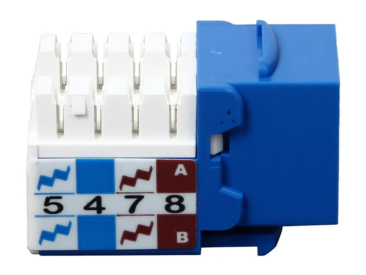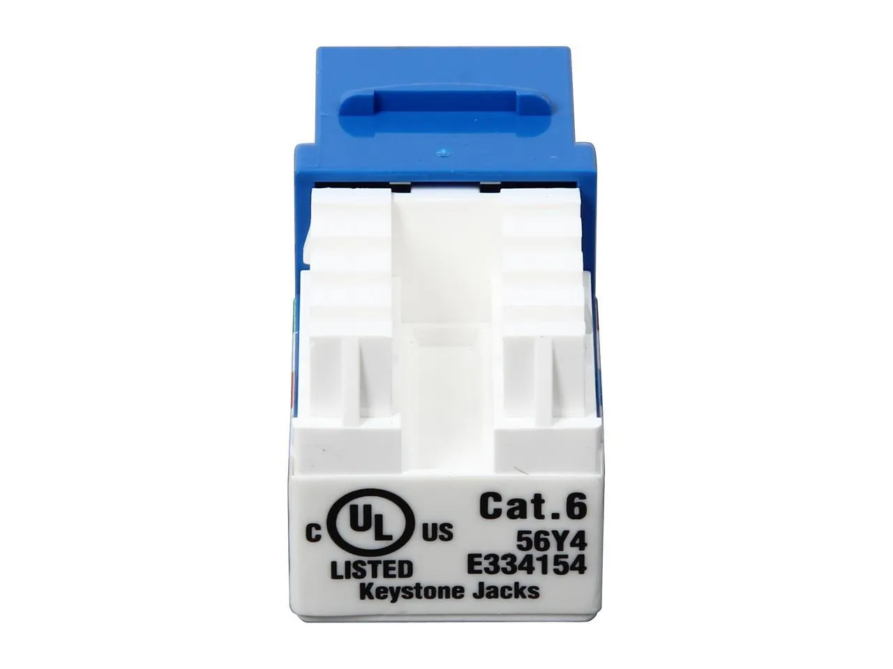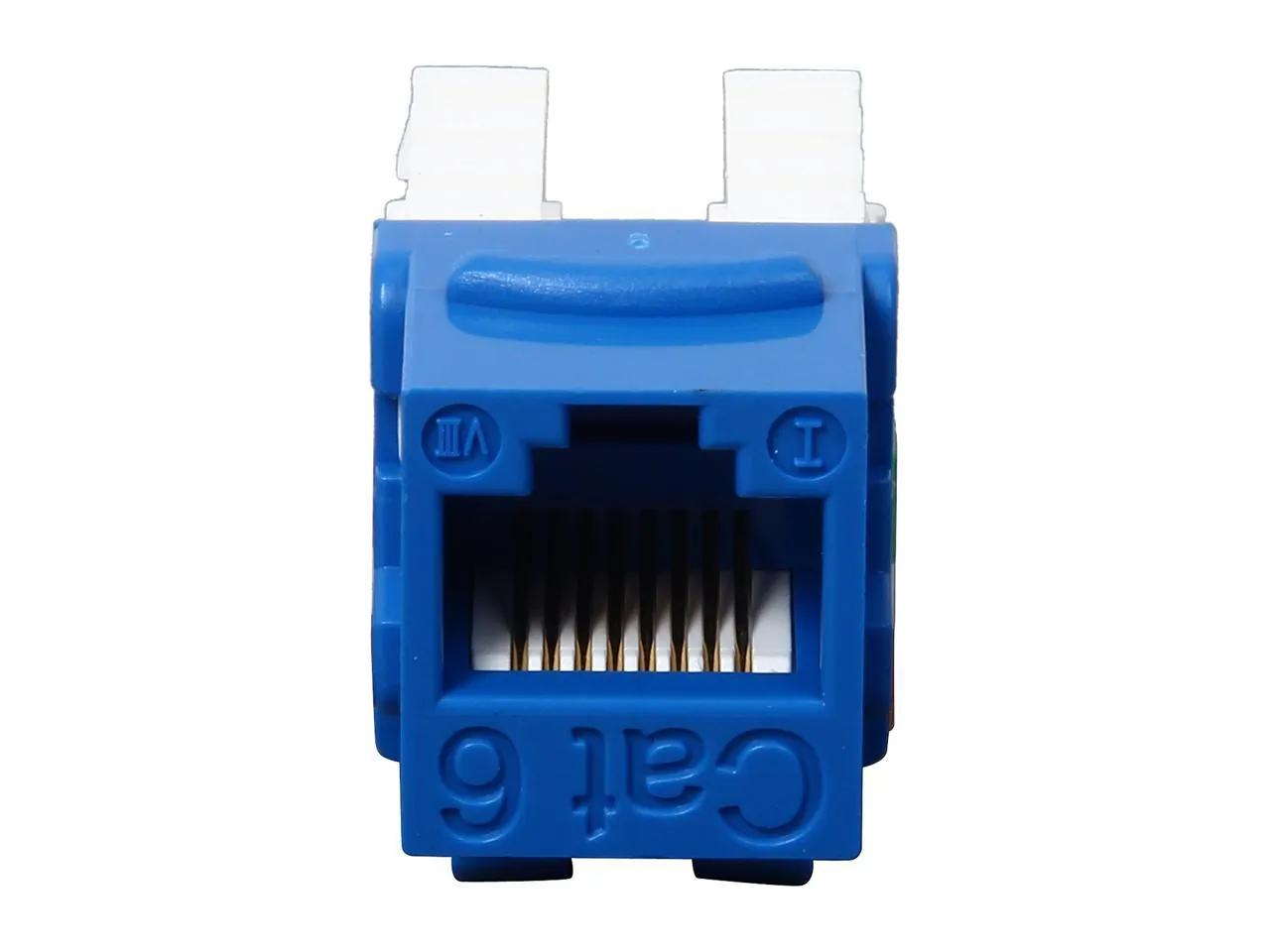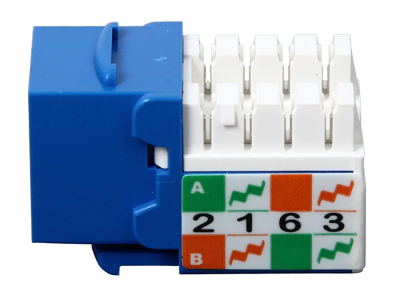 • For use in CAT-6 or CAT-5E installations;• Compliant with EIA/TIA CAT-6 connecting hardware specifications;• Dual color coded labeling made for both 568A & 568B wiring schemes;• Compact casing fits into any conventional face plate, outlet box or panel;• Uniquely patterned, printed circuit board;• Compliant with the Federal Trade Agreements Act (TAA) for GSA schedule purchases;• Lifetime warranty;• Blue;